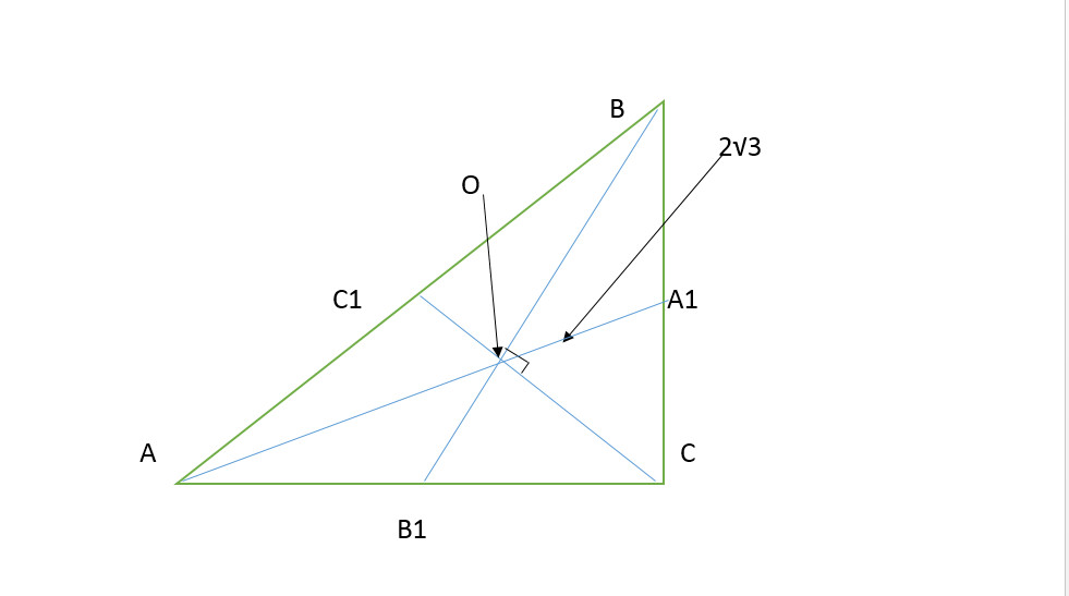 в прямоугольном треугольнике ABC с прямым углом C медианы CC1 и BB1 перпендикулярны друг другу. Найти длину большей из этих медиан, если длина третьей медианы AA1 = 3 корень из 3.