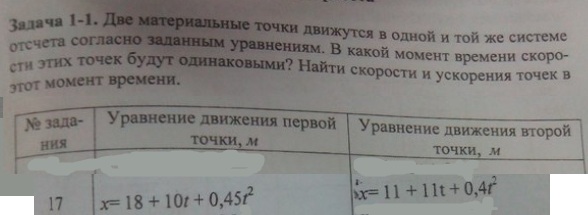 Чтобы найти в какой момент времени скорости будут одинаковыми, надо от каждого уравнения взять производную. Это и будет уравнение для расчёта скоростей точек. Потом их надо приравнять, из полученного равенства найти время, подставить в уравнения скоростей.
