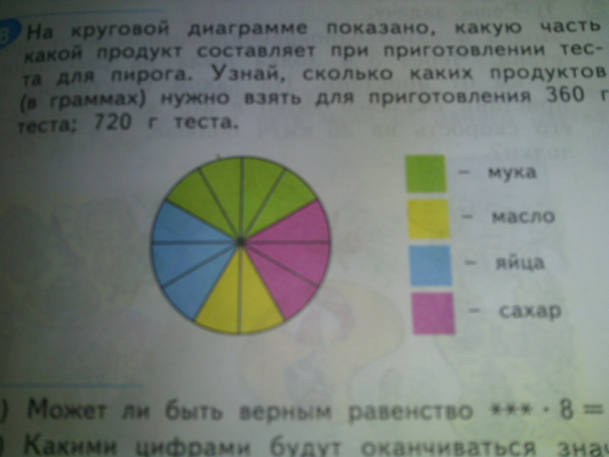 Помогите с задачкой. На круговой диаграмме показано какую часть какой продукт составляет при приготовлении теста для пирога. Узнай сколько каких продуктов в граммах нужно взять для приготовления 360 г теста; 720 г теста.