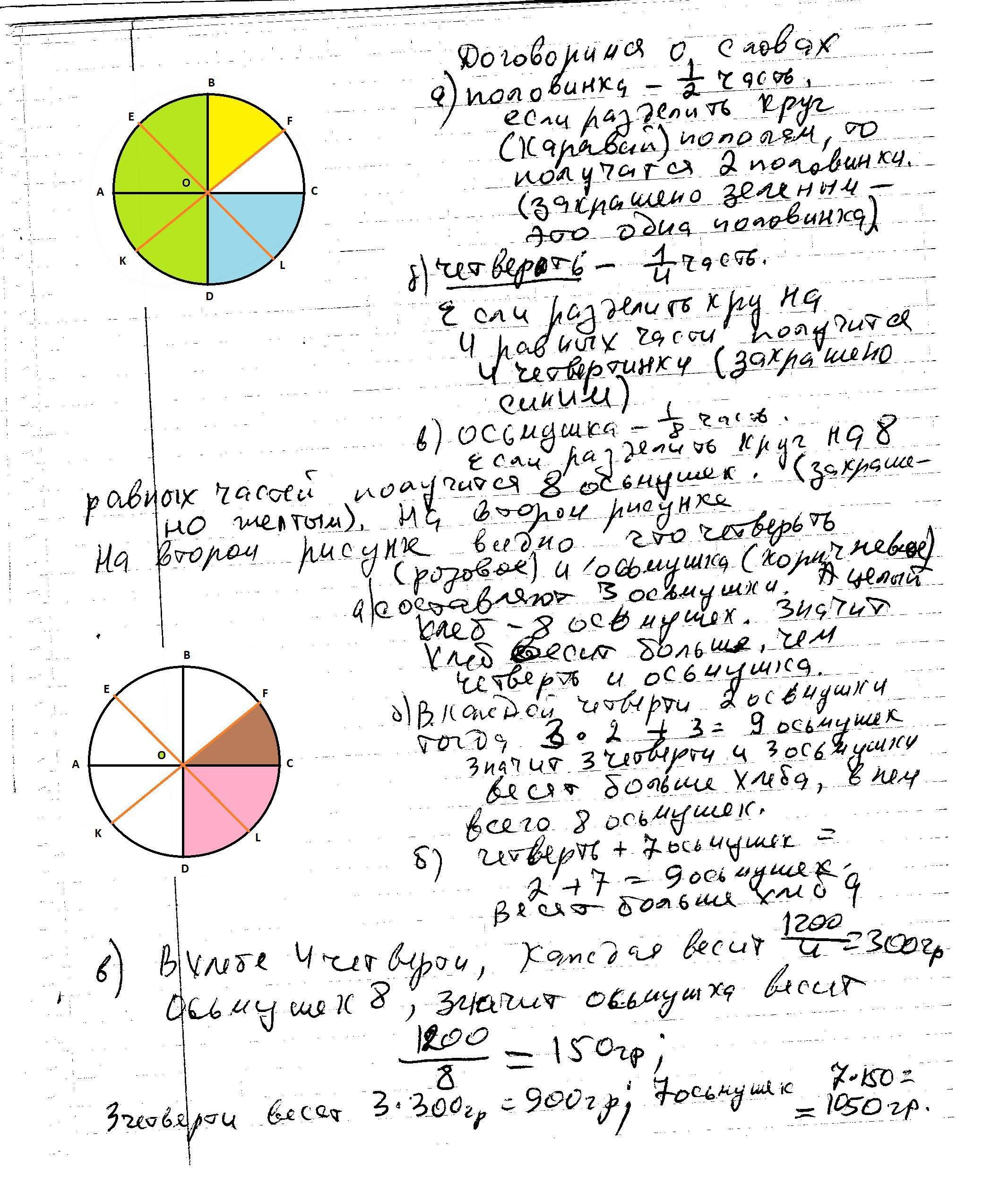 задача.В старину хлеб считали половинками,четвертями и осьмушками.Сколько четвертей составляют целый каравай?Сколько осьмушек?Больше или меньше каравая весят:четверть и осьмушка?три четверти и три осьмушки?семь осьмушек и четверть?Каравай весит 1200г.Сколько весят :четверть;осьмушка; три четверти;семь осмушек?
