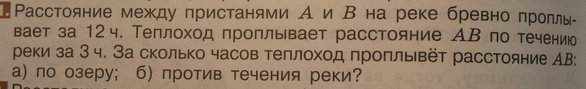 обозначим расстояние между пристянями через S, тогда мы сможем записать, что скорость бревна равна S/12 (и она равна скорости течения реки), а скорость теплохода по течению реки равна S/3. чтобы узнать собственную скорость теплохода (в стоячей воде - в озере) необходимо из корости по течению вычесть скорость течения