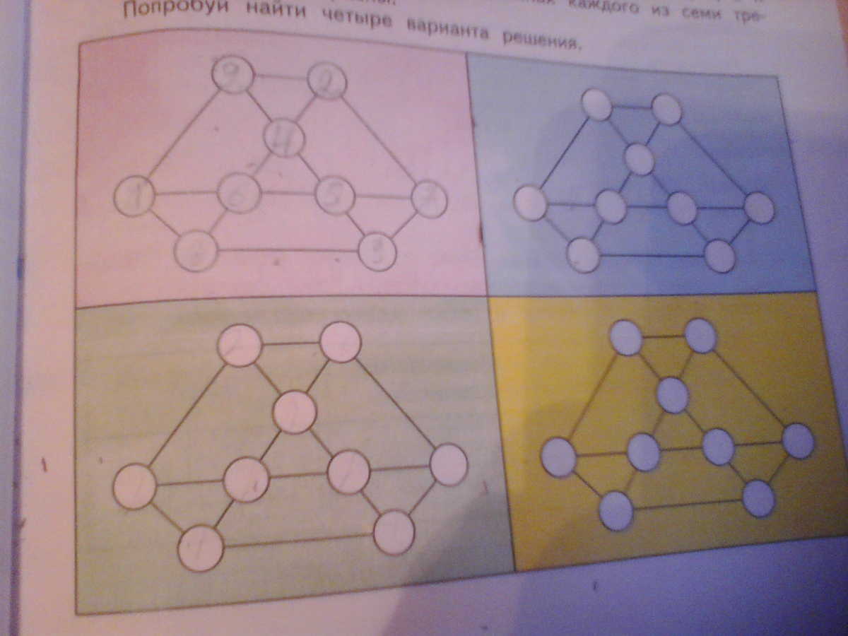 расставь в кружках числа 1,2,3,4,5,6,7,8 и 9 так чтобы суммы чисел в вершинах каждого из семи треугольников были равны . попробуй нацти четыре варианта.