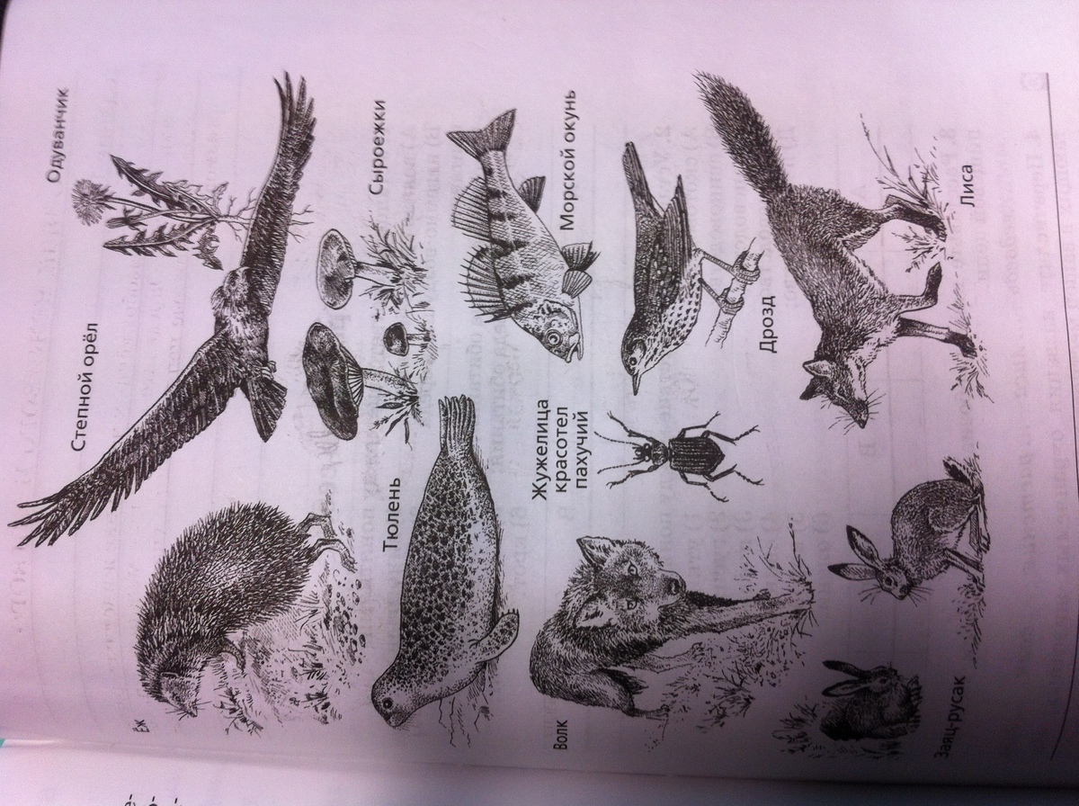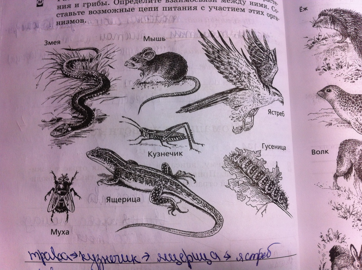 Рассмотрите изображённых на рисунке животных, растения и грибы. Определите взаимосвязи между ними. Составьте возможные цепи питания с участием этих организмов. Там на рисунке есть: змея,мышь,ястреб,кузнечик,муха,ящерица,гусеница,еж,степной орел,одуванчик,тюлень,сыроежки,волк,жужелица красотел пахучий,морской окунь,дрозд,заяц-русак,лиса. Подсказка:цепь питания нужно начинать с растения или грибов.: