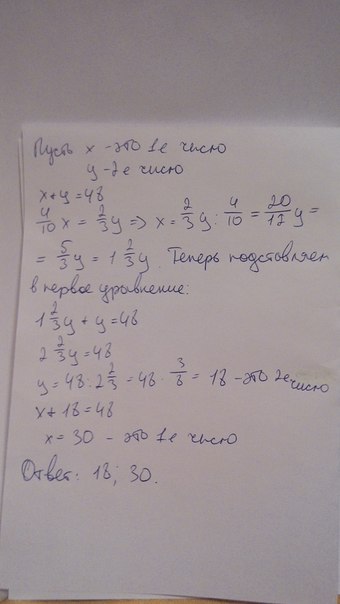 сумма 2 чисел = 48.Найдите эти числа,если 40% одного из них равна две третьих другого-скажите пожалуйста буду рад