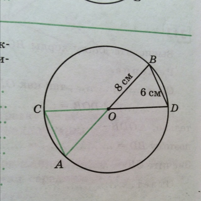 Так как АО=ОВ как радиусы, то и СО=ОD, а третья сторона по формуле трех сторон, потом все стороны слаживаеш, и профит