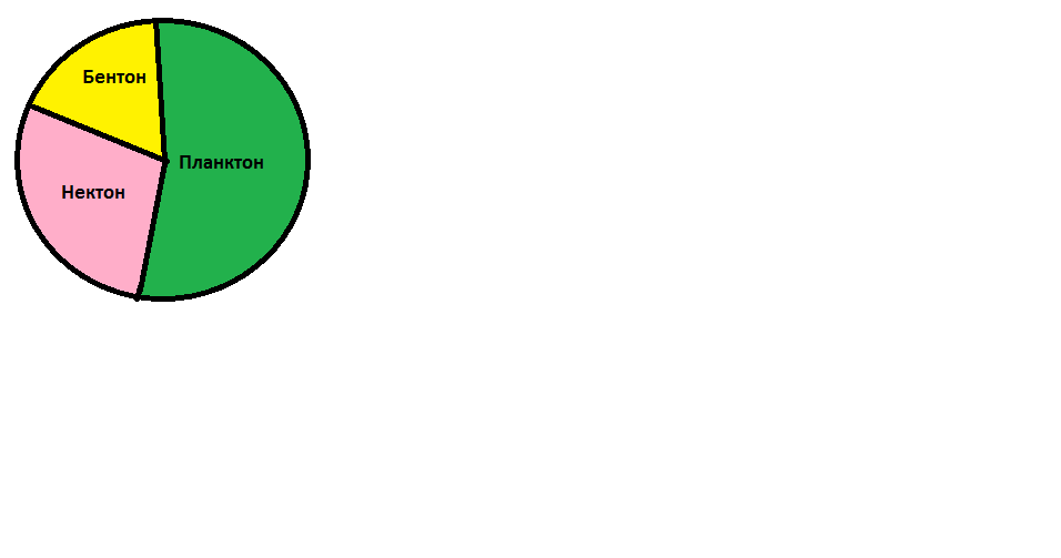 Масса всех живых организмов,населяющих Мировой океан,составляет около 64 млрд т,из них масса планктона-микроскопических водорослей и животных-36 млрд т,масса нектона-рыб,тюленей,моржей,китоподобных,моллюсков-18 млрд т,а остольное-масса бентона-донных животных.Найдите проценты массы планктона,нектона,бентоса.Постройте соответствующую круговую диаграмму.