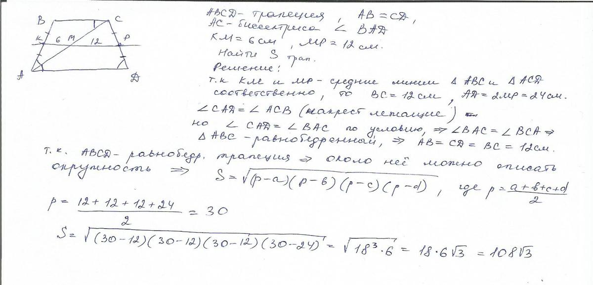 в равнобокой трапеции диагональ является биссектрисой острого угла и делит среднюю линию трапеции на отрезки длиной 6 см и 12 см. найдите площадь трапеции.