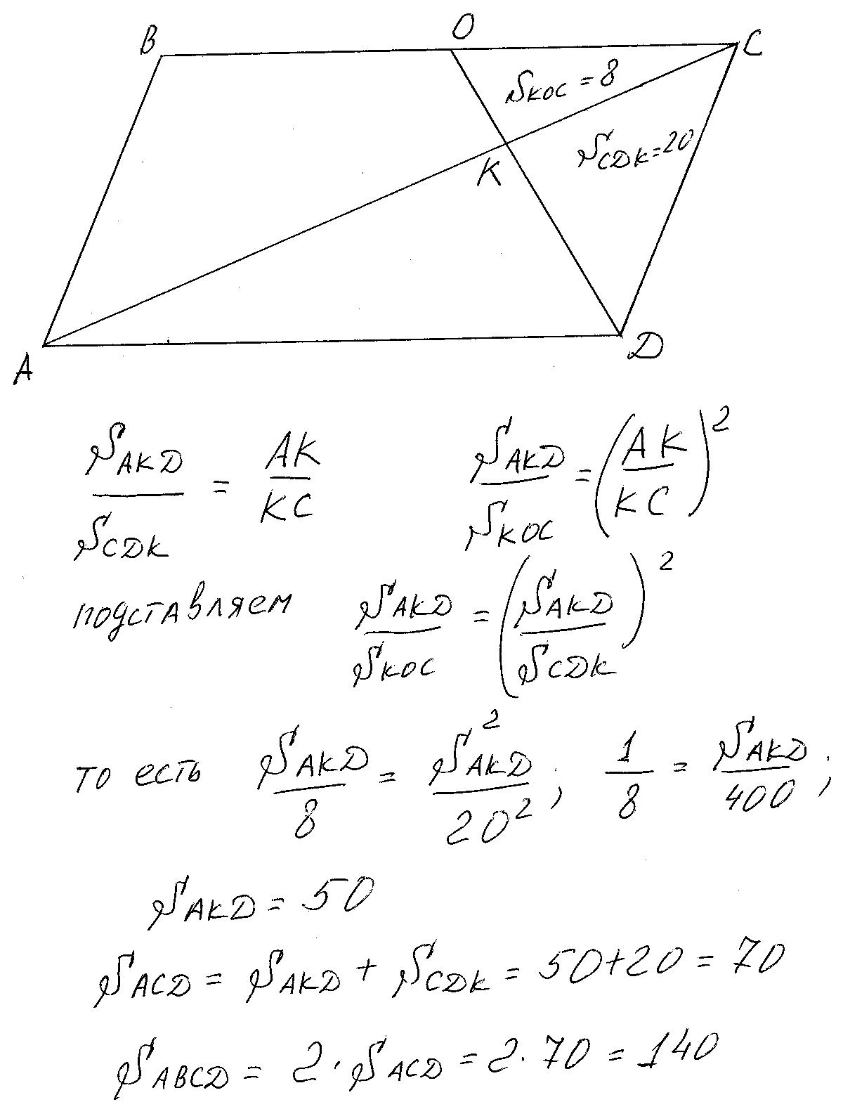 Вершина D параллелограмма ABCD соединена с точкой O на стороне ВС . Отрезок DO пересекает диоганаль AC в точке K.SтреугKOC=8 SтреугCDK=20 Найти площадь параллелограмма