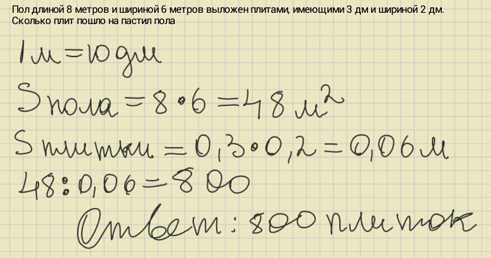 Пол длиной 8 метров и шириной 6 метров выложен плитами, имеющими 3 дм и шириной 2 дм.
