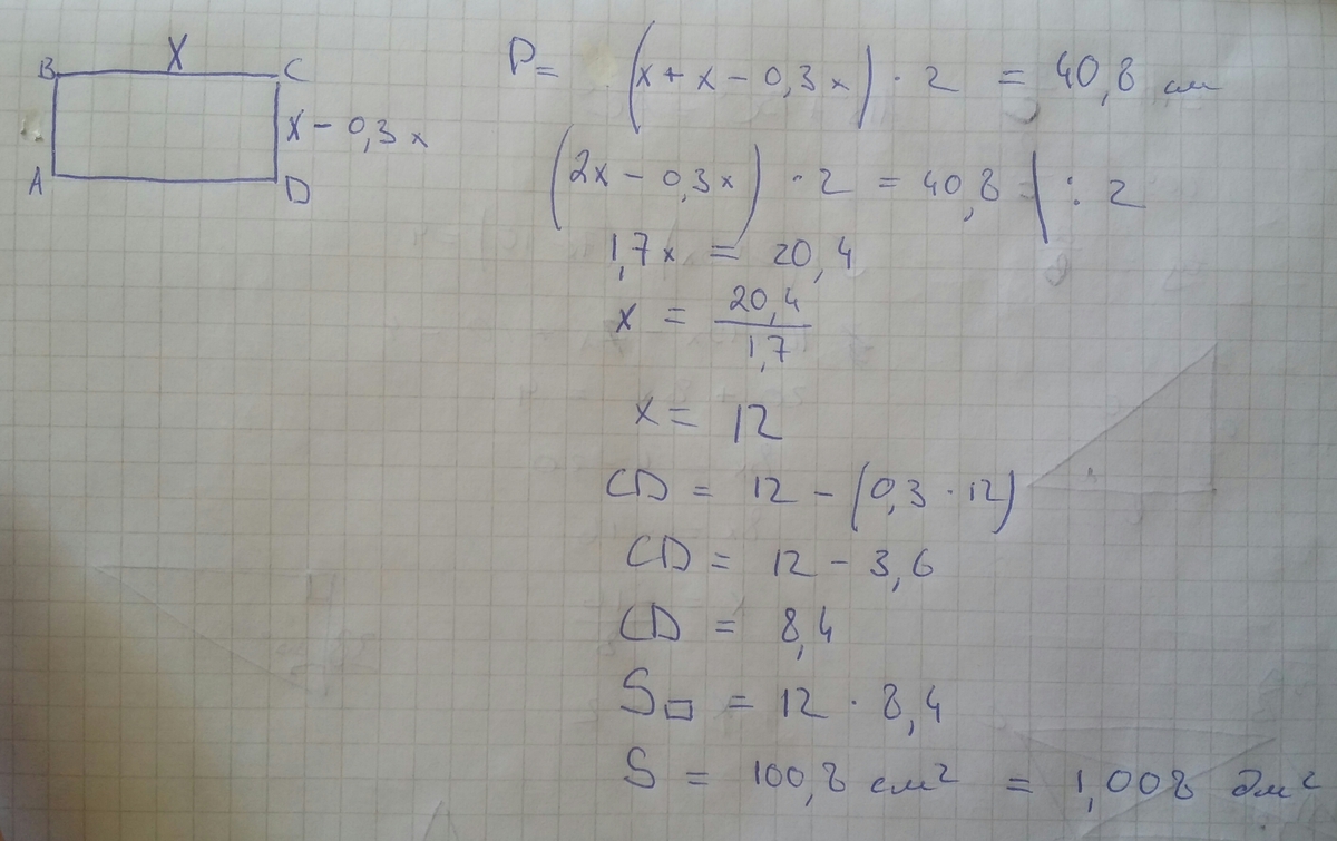 Решите задачу:ширина прямоугольника на30% меньше длины а его периметр равен 40,8см.Найди площадь прямоугольника.Вырази эту площадь в квадратных дециметрах.