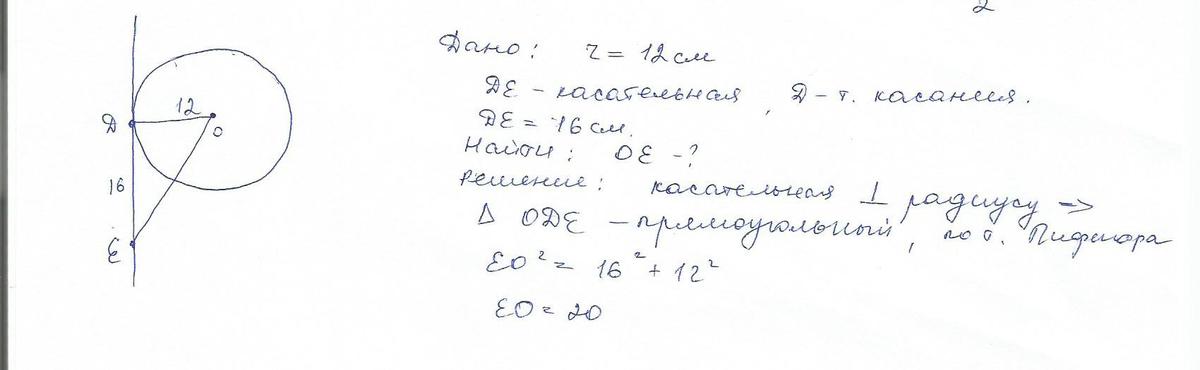 К окружности с центром O и радиусом 12 см проведена касательная DE(D-точка касания)Найдите длину отрезка OE,если DE=16 см