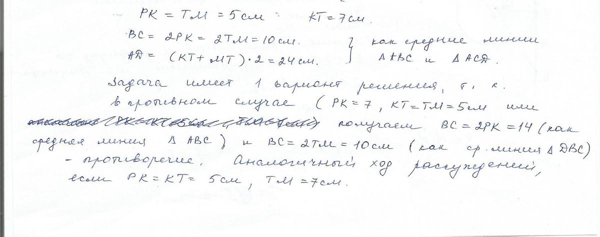 3.Диагонали трапеции делят среднюю линию на три отрезка два из которых равны 5 см и 7 см. Найдите основания трапеции. Сколько решений имеет данная задача?