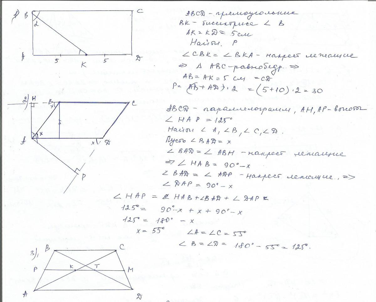1.Биссектриса угла прямоугольника делит его сторону на две части, каждая из которых равна 5 см. Найти периметр прямоугольника.