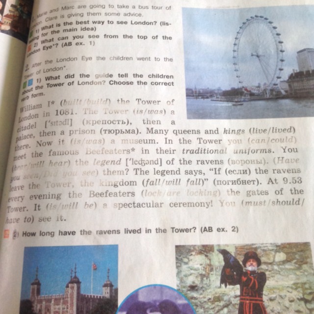 Уильям 1 построил Лондонский Тауэр в 1081. Башня была крепостью, затем дворцом, затем тюрьмой. Множество королев и королей жили здесь. Теперь это музей. В башне вы можете встретить известных бифитеров (стражников Лондонского Тауэра) в традиционной униформе. Вы услышите легенду о воронах (ударение на первый слог). Видели ли вы их? Легенда гласит, "Если вороны покинут Тауэр, королевство погибнет. В 9.53 каждый вечер бифитеры замыкают ворота Тауэра. Это захватывающее зрелище! Вы должны увидеть его.