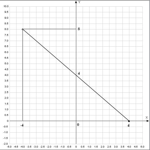 Построим прямую по двум точкам (например, x=0, y= -4; x=4, y=0) в пределах ОДЗ. Точка (-4;8) "пустая", т.е не входит в график.