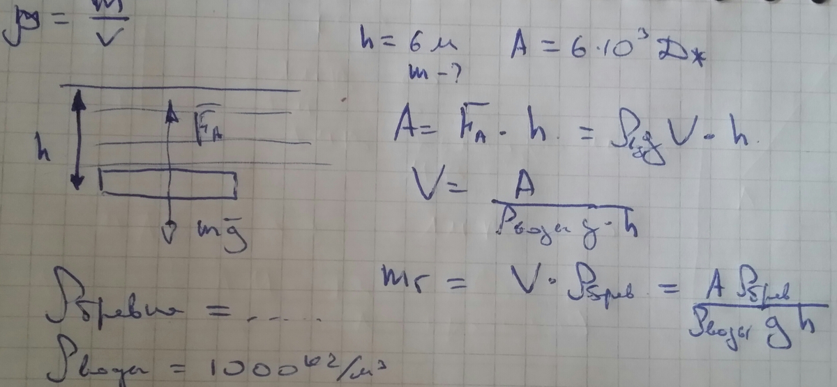 Сосновое бревно всплыло со дна водоема. Выталкивающая сила совершила работу 6 кДж. Какова масса бревна, если глубина водоема 6 м?