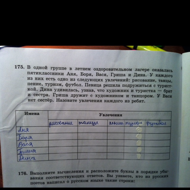 Подведем итоги: Аня - "Туризм", Боря - "Рисование", Вася - "Танцы", Гриша - "Футбол", Дина - "Пение".