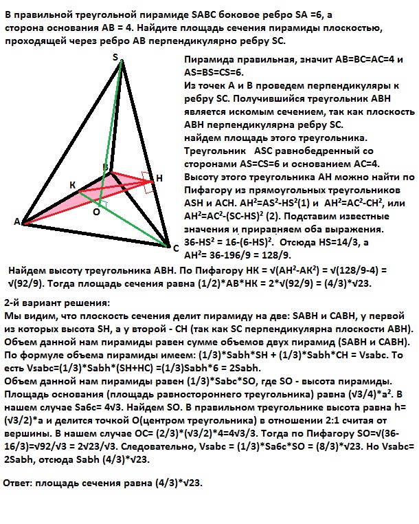 Ответ: площадь сечения равна (4/3)*√23.