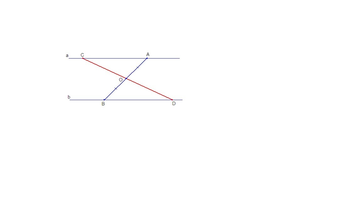 концы отрезка AB лежат на параллельных прямых а и в. прямая , проходящая через сереДину О этого отрезка , пересекает пряЫМе а и в в точках С и D . ДОКАЖИТЕ , ЧТО CO=OD СПАСИБО!!!! ОЧЕНЬ СРОЧНО НАДО!!!!!пожалуйста помогите!!!!!!!