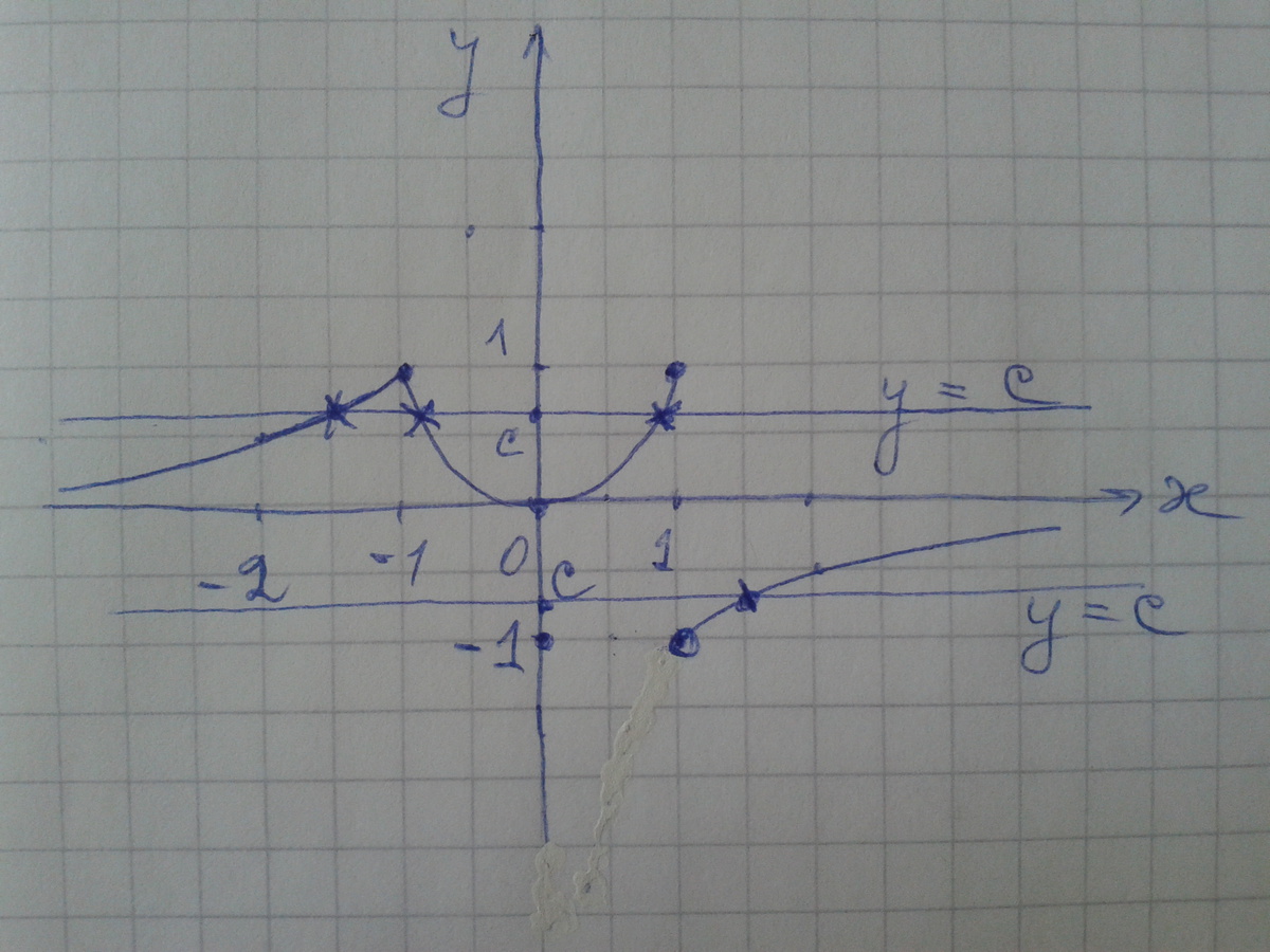 Если провести прямые у=с, то это будут прямые, параллельные оси ОХ и проходящие через точки (0,с).Одну точку пересечения прямая будет иметь с графиком функции, если число с будет в промежутке от -1 до 0 (включительно).