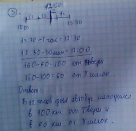 3) На каком расстоянии от Химок и от Твери автобус находился в 12 ч дня?