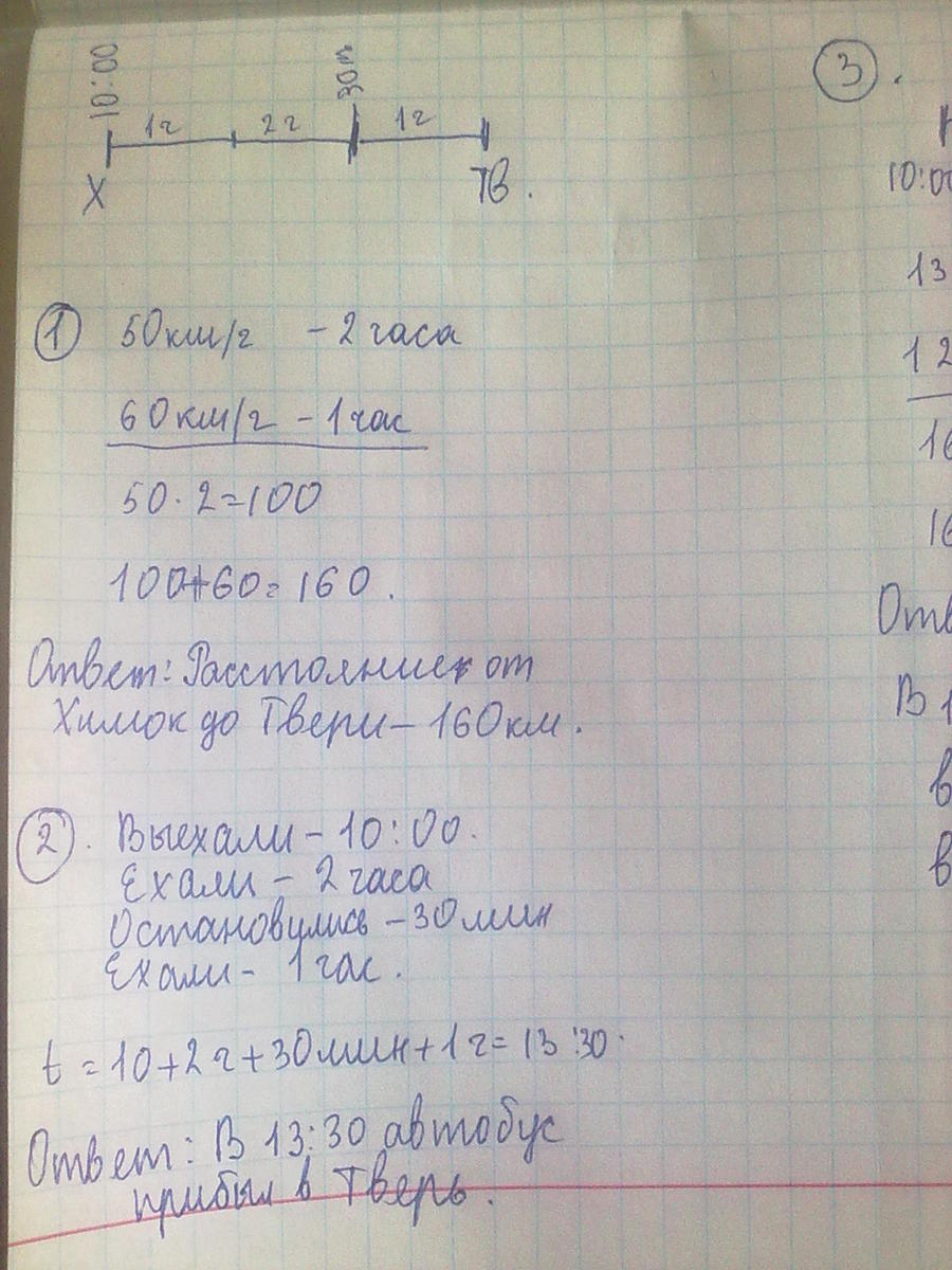 В выходной день отец и сын решили поехать в гости к друзьям в Тверь. Они сели в автобус, который выехал из Химок в 10 часов утра со скоростью 50км/ч. Через 2 ч пути автобус сделал остановку на 30 мин, а затем продолжил путь со скоростью 60км/ч. Через 1 ч после остановки автобус прибыл в Тверь, где отца и сына встречали их друзья.