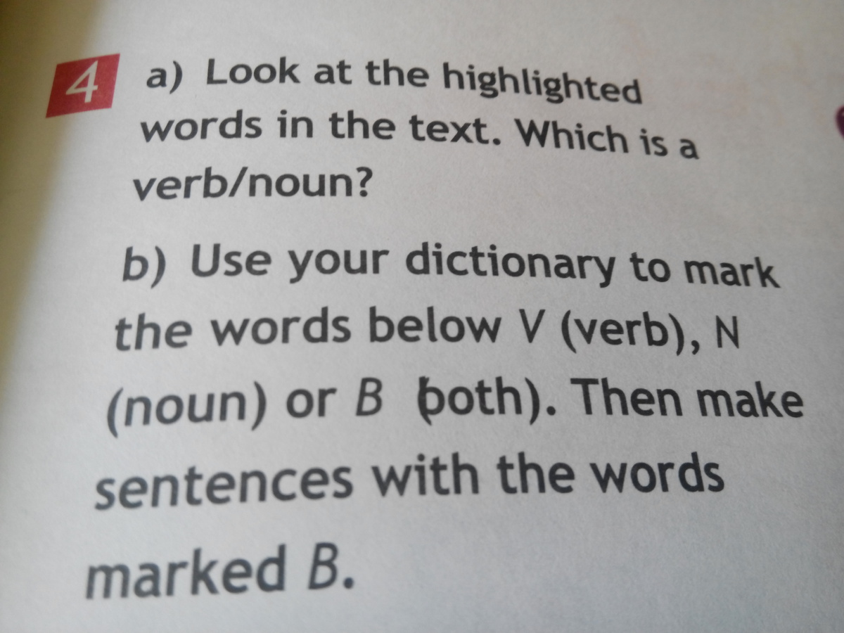 а) Посмотрите на выделенных слов в тексте. Какой глагол / существительное? б) Используйте ваш словарь, чтобы отметить приведенные ниже слова V (глагол), N (существительное) или B, и другое). В частности, марка предложения со словами буквой B.