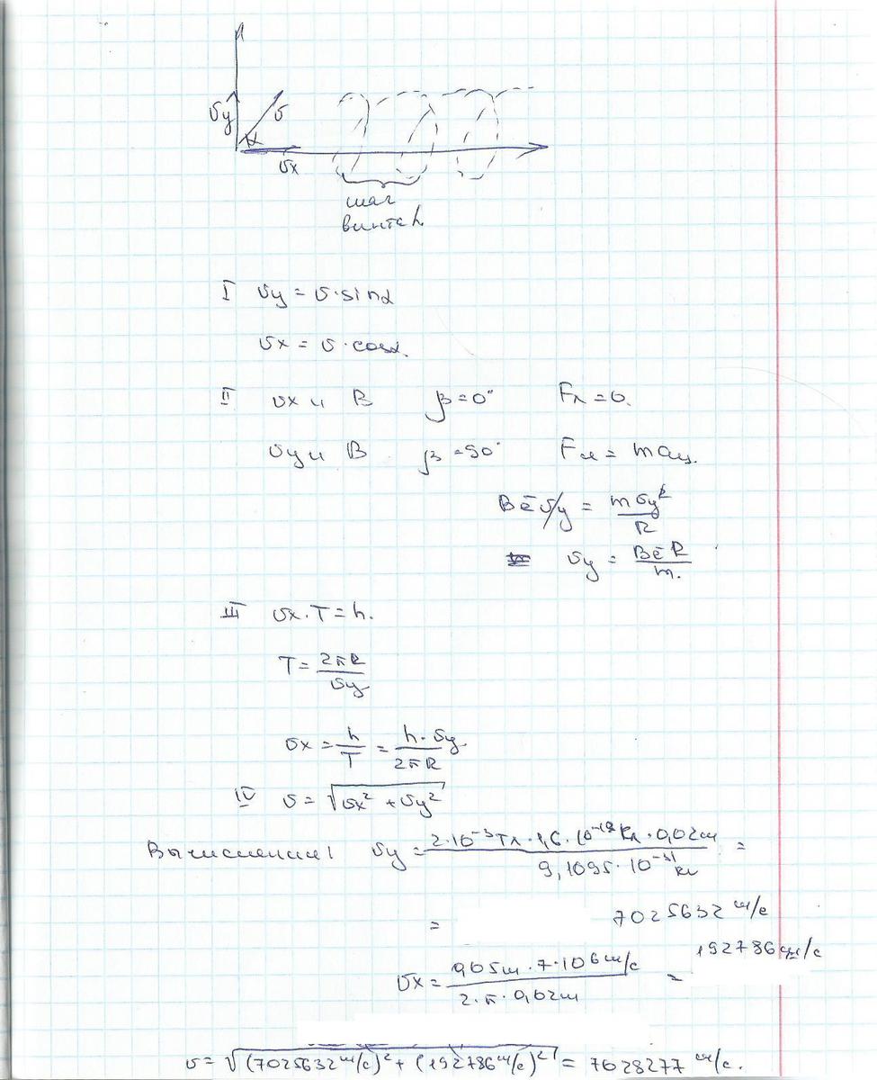 Электрон движется в магнитном поле,индукция которого 2 мТл,по винтовой линии радиусом 2 см и шагом винта 5 см.Определите скорость электрона.
