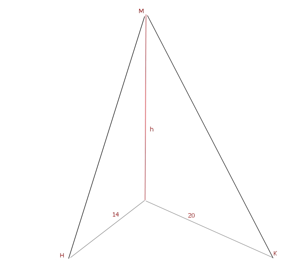 з точки М до площини а проведено похилі МН І МК, довжини яких відносяться як 25:26. Знайдіть відстань від точки М до площини а,якщо довжини проекцій МН І МК на цю площини дорівнюють 14 см і 20 см відповідно