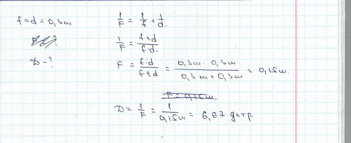 Визначте оптичну силу збиральної лінзи , якщо зображення предмета ,що міститься на відстані 30 см від лінзи, розташоване по інший бік від лінзи на такій самій відстані від неї))))))))!!!!!!!!!!!!!!