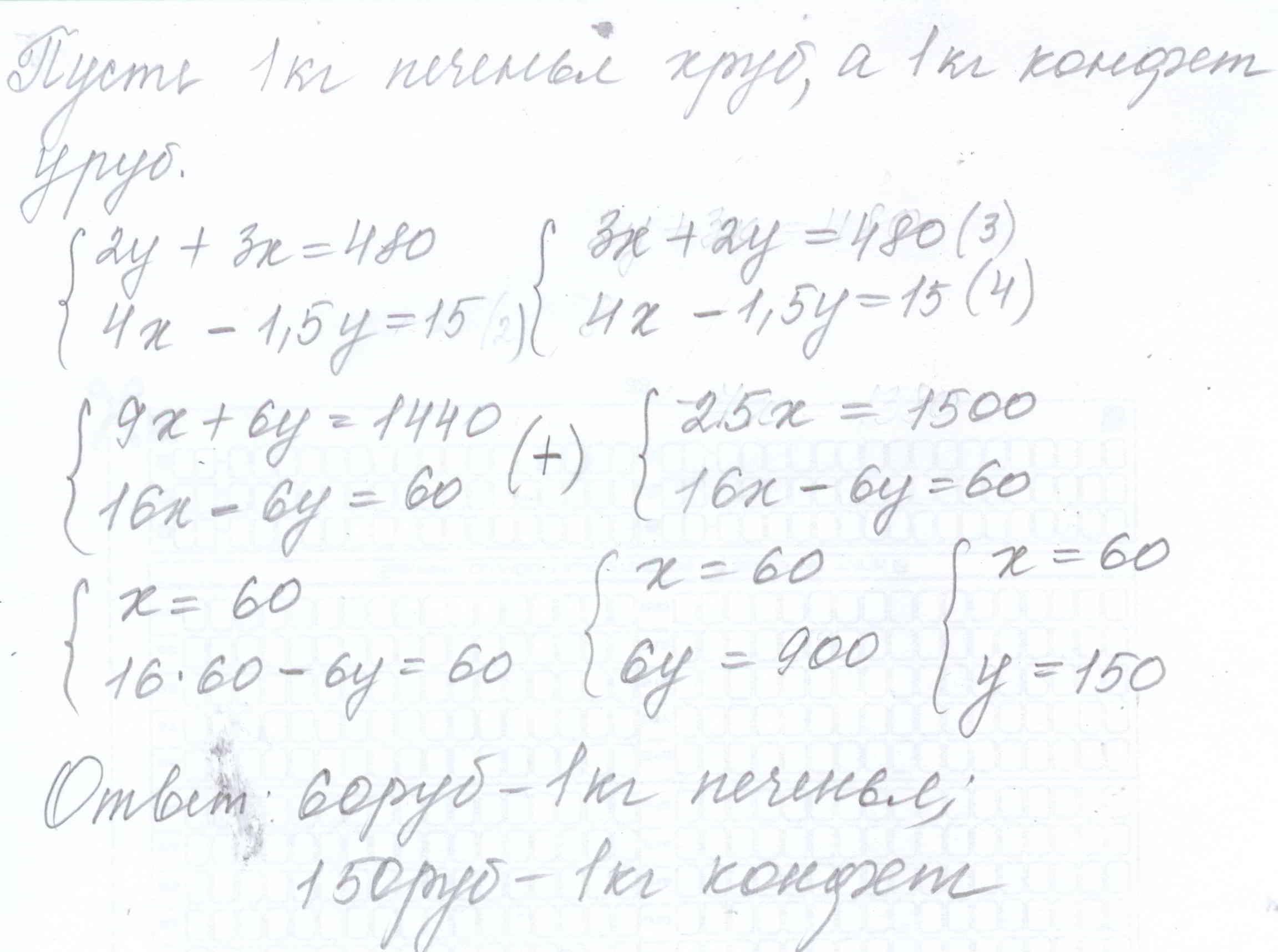 За 2кг конфе и 3кг печенья заплатили 480 р. Сколько стоит 1 кг печенья и 1 кг конфет, если 1,5 кг конфет дешевле 4 кг печенья на 15 р.?