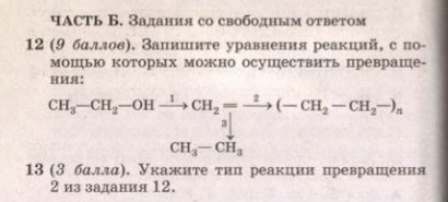 1) СH3 - CH2 - OH ---H2SO4(конц.) t----> CH2=CH2 + H2O