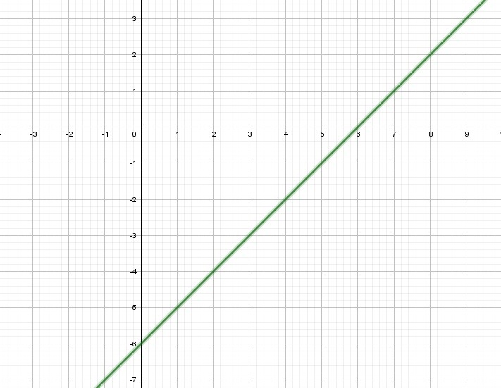 Графиком линейной функции является прямая. Для построения прямой достаточно взять две точки, к примеру: (0;-6), (6;0).