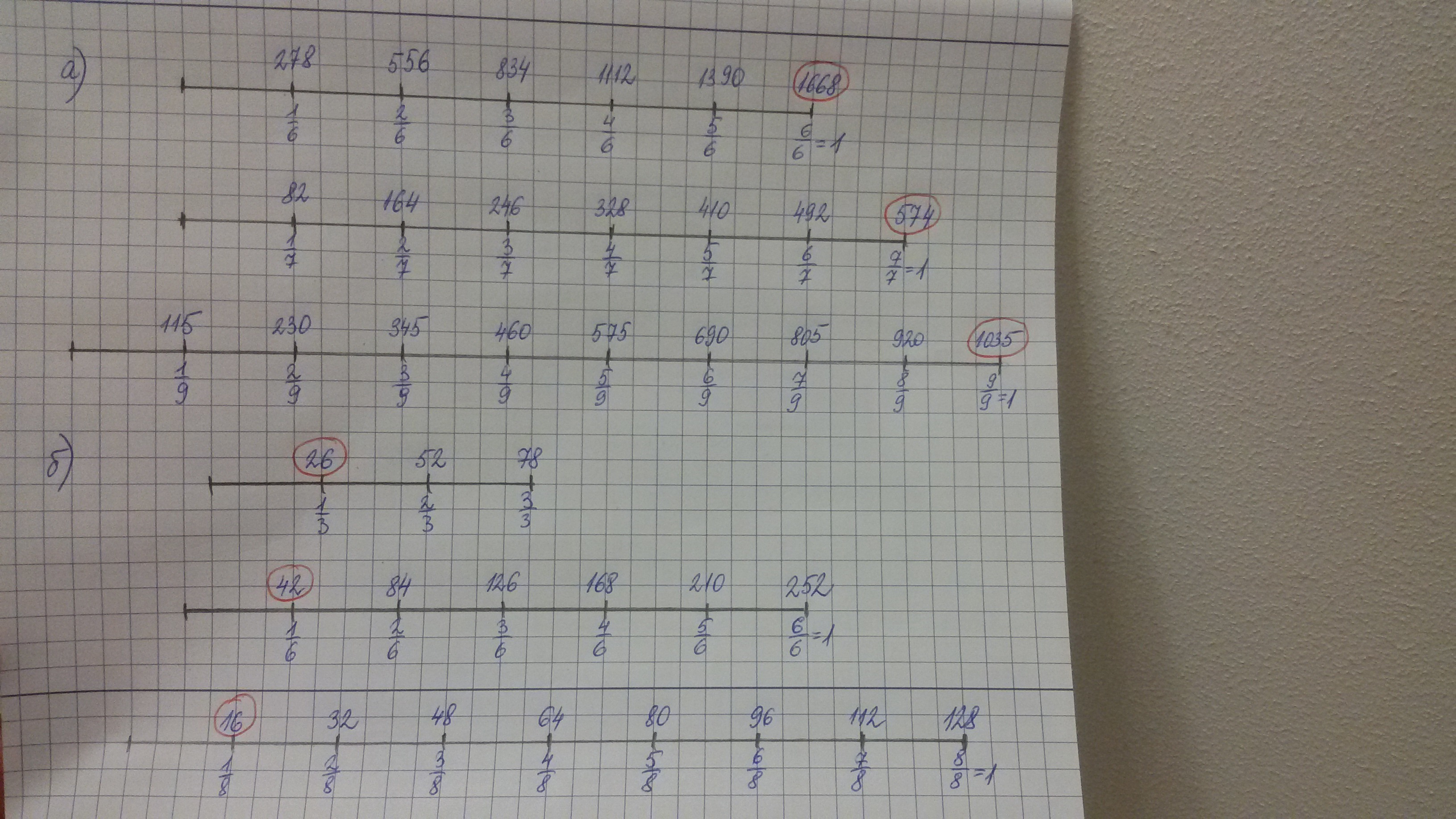 Изобрази на схеме и вычисли:а) число,у которого... одна шестая=278. одна седьмая=82. одна девятая=115. б)...часть числа:одна третья от 78. одна шестая от 252. одна восьмая от 128