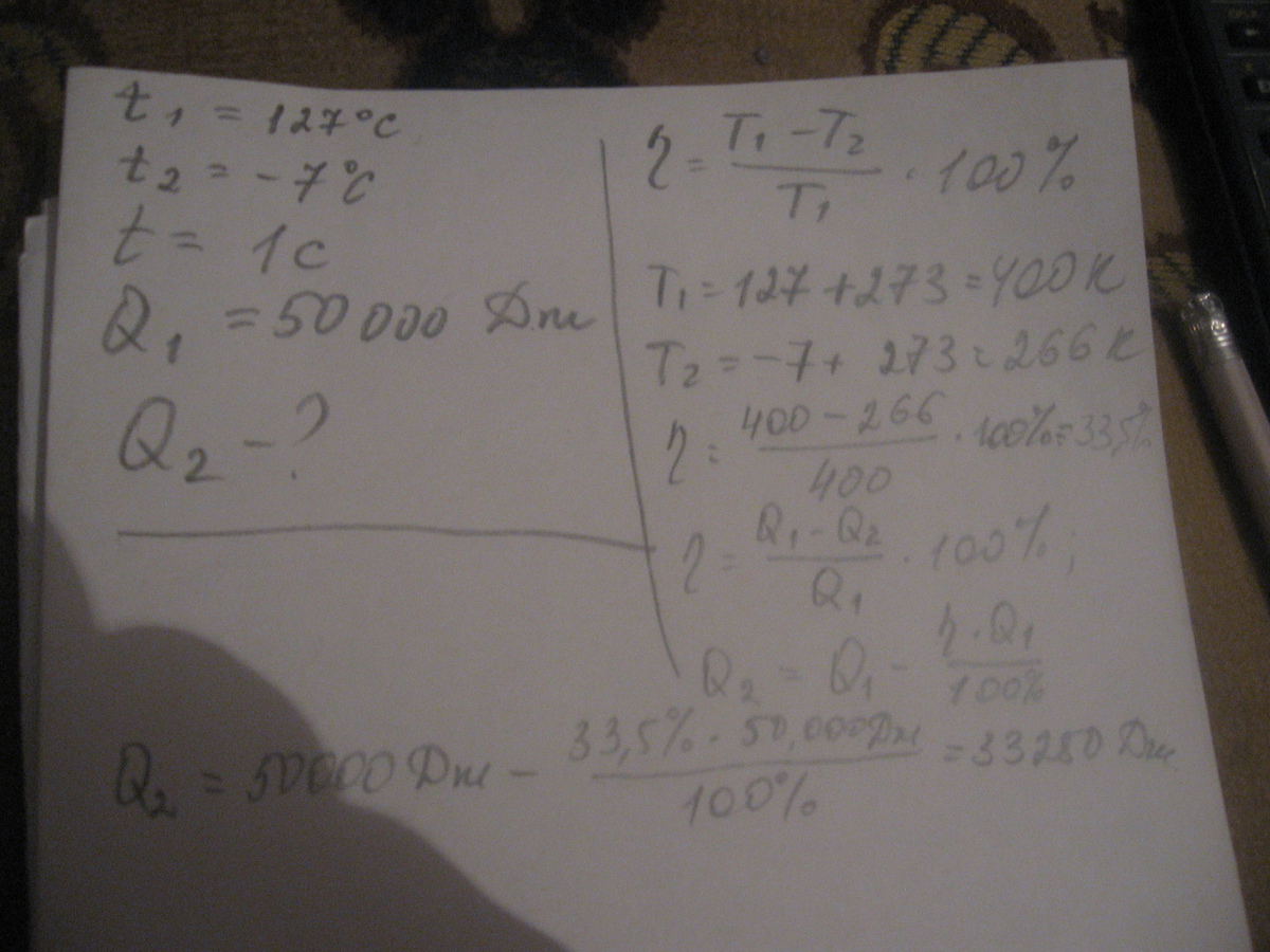 Температура нагревания идеального теплового двигателя 127 С, а холодильника - 7 С. Какое количество теплоты отдается холодильнику за 1 сек, если двигатель ежесекундно получает от нагревателя 50 кДж энергии.