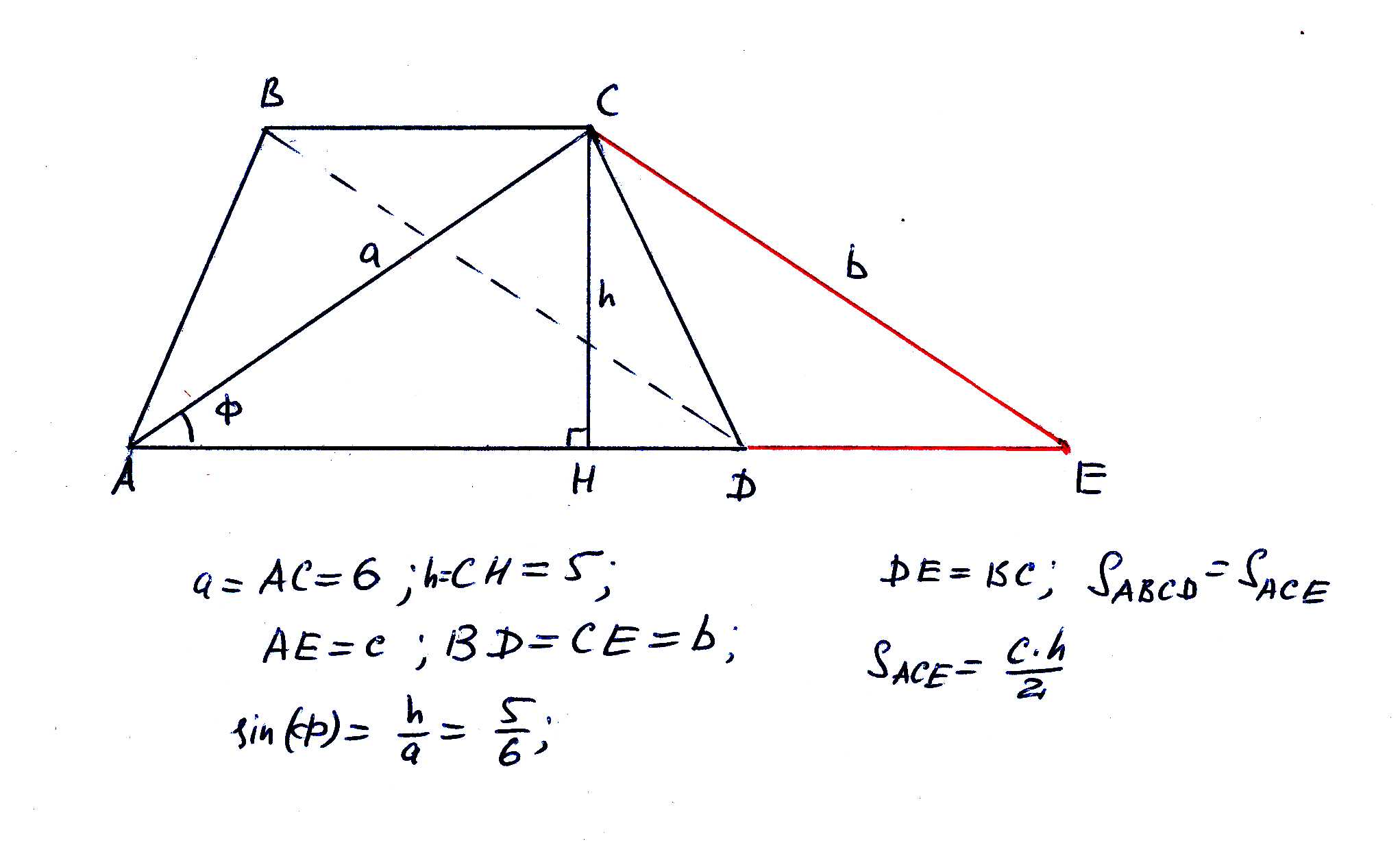 Типовое построение - проводим через вершины малого основания прямую II диагонали, НЕ проходящей через эту вершину, до пересечения с продолжением большого основания. Получается треугольник, РАВНОВЕЛИКИЙ (имеющий ту же площадь) трапеции (у него основание равно сумме оснований трапеции, а высота - общая с трапецией).