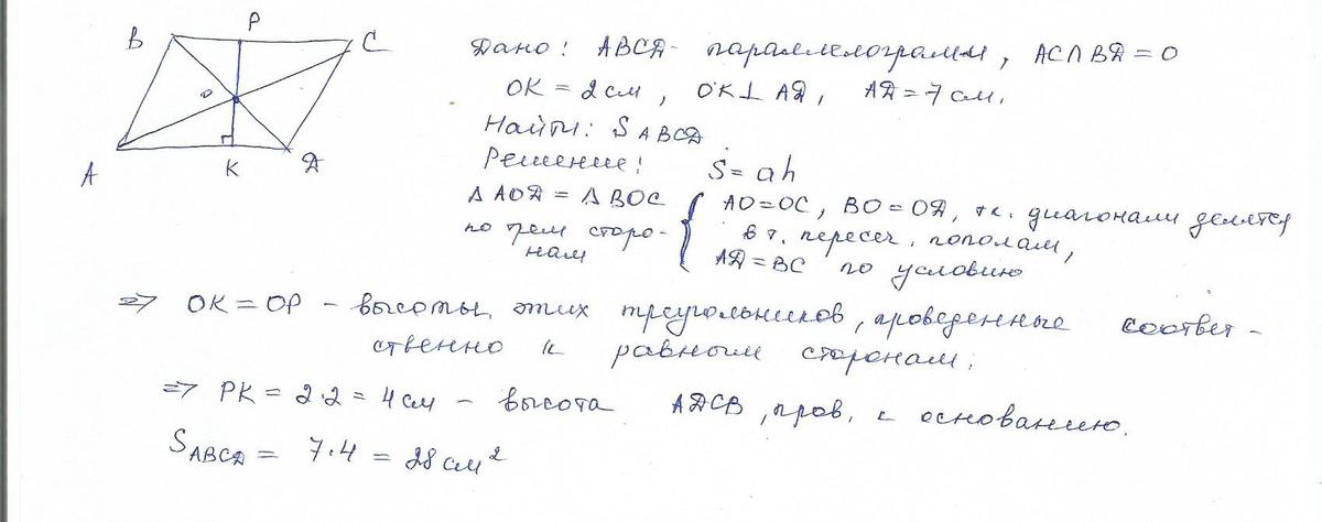 Сторона параллелограмма равна 7 см,а расстояние от точки пересечения диагоналей параллелограмма до этой стороны равно 2 см.Найдите площадь параллелограмма