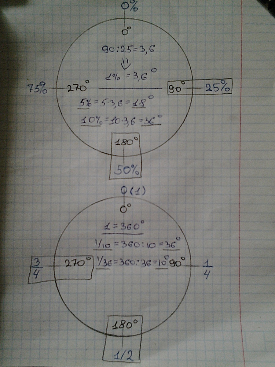 какая градусная мера угла на круговой диаграмме соответствует 5%,10%,25%,и 50 %какая градусная мера угла на круговой диаграмме соответствует 1/10,1/2,3/4,1/36?