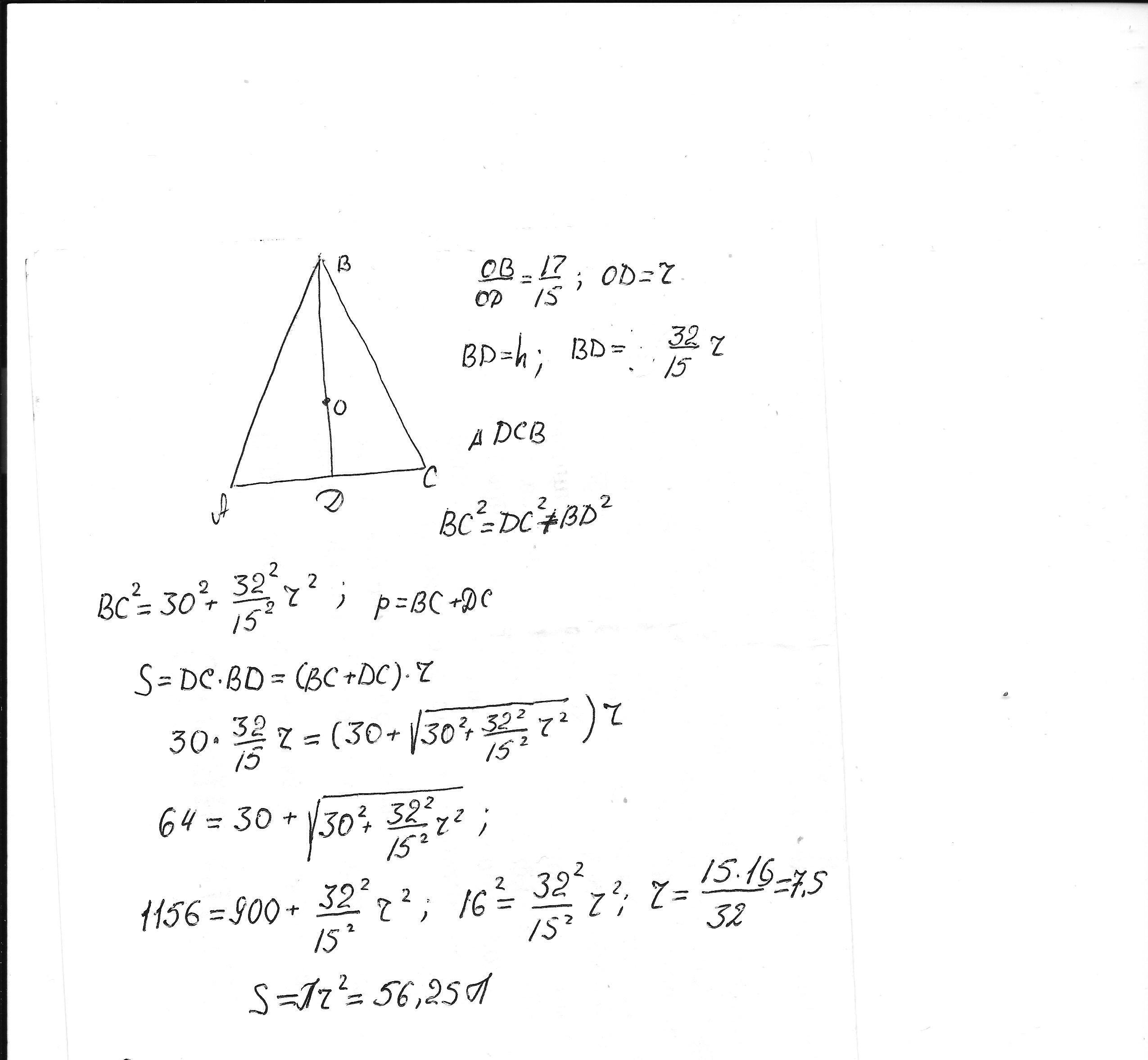 В равнобедренном треугольнике центр вписанного круга делит высоту в отношении 17:15 .Основание равно 60 см,найдите площадь этого круга