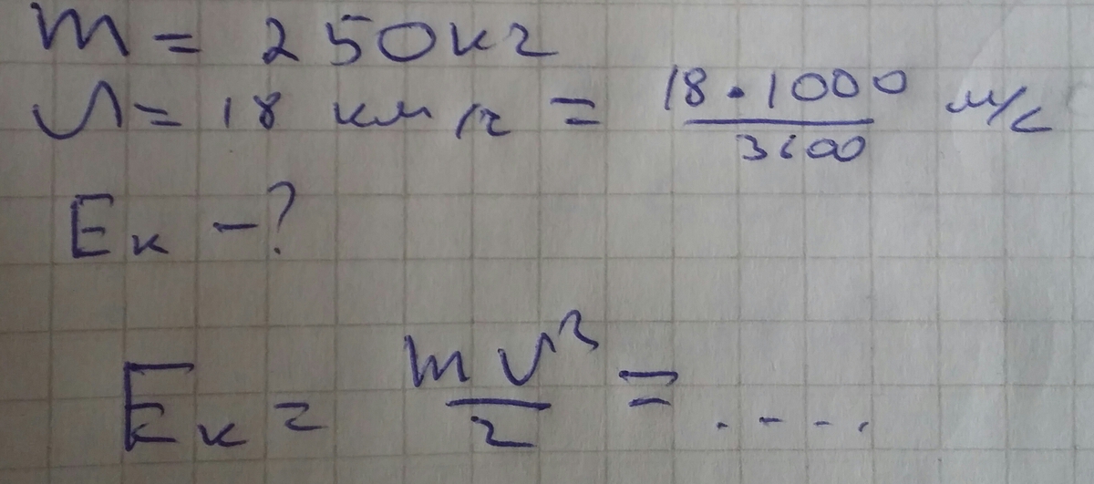 Акула массой 250кг плывет со скоростью 18 км/ч. Определите кинетическую энергию.