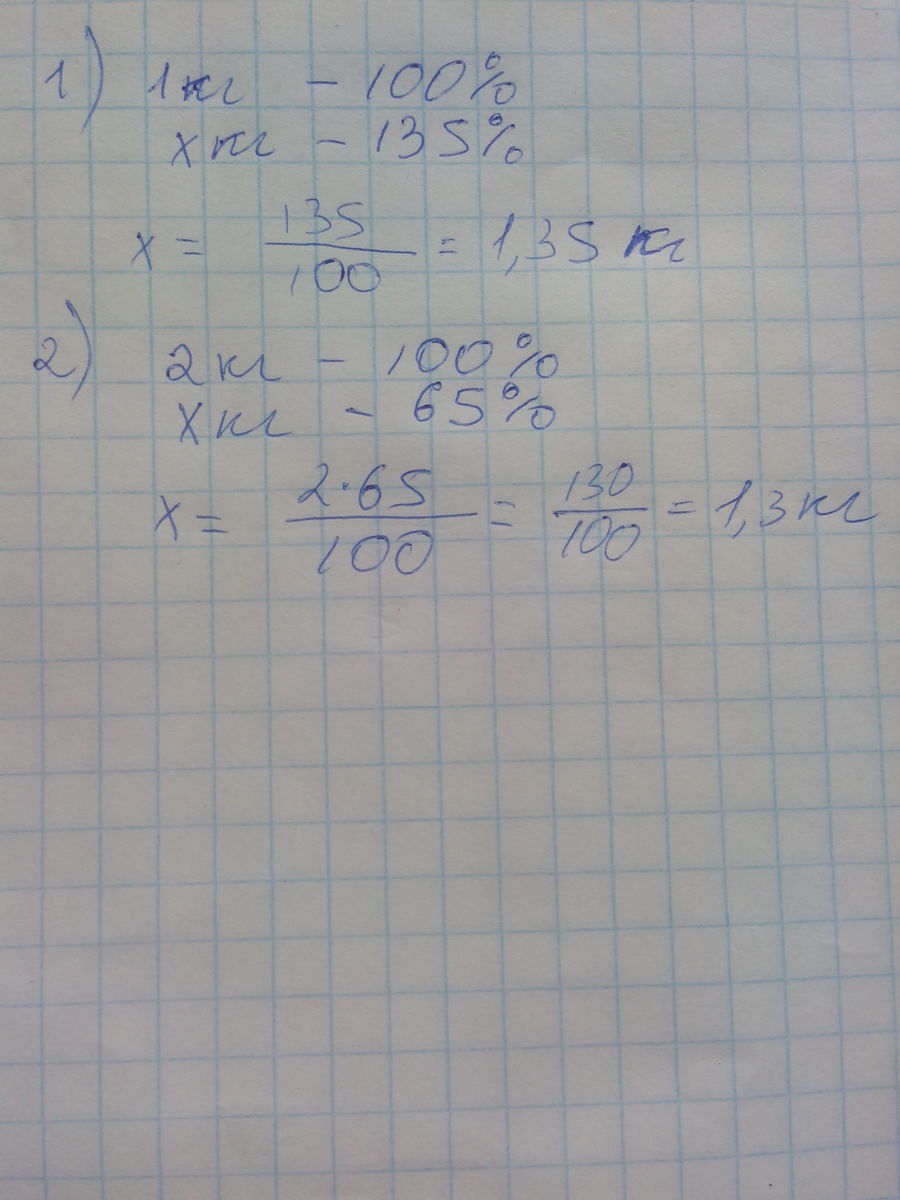 решите задачу-Мясо теряет при варке около 35% своего веса.Сколько свежего мяса надо взять,чтобы получить 1 кг варёного?сколько варёного мяса получиться из 2 кг свежего?