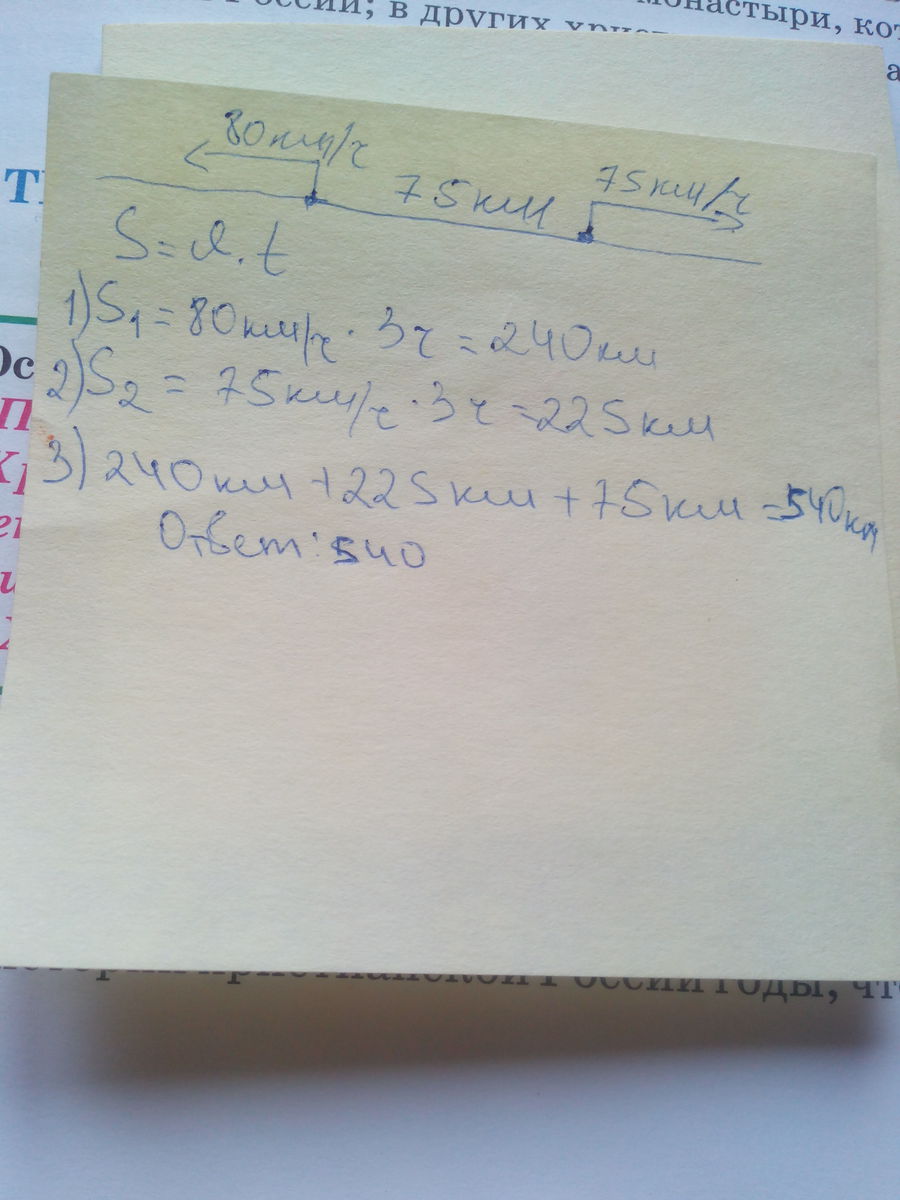 из двух городов расстояние между которыми 75 км,отправились одновременно в противоположных направлениях два поезда.один шёл со скоростью 75км/ч другой 80км/.какое расстояние будет между поездами за 3 часа?