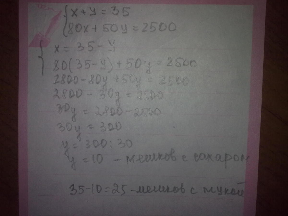 весь груз составляет 2 тонны 500 кг .мешок муки весит 80 кг а сахара - 50 кг