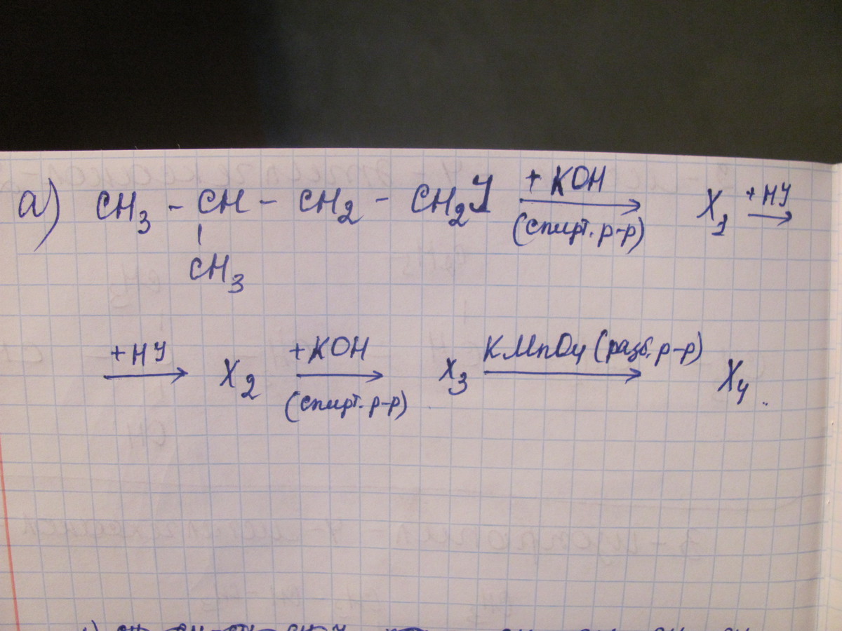 1. 1) СН3-СН(СН3)-СН2-СН2-I + KOH -EtOH-> CH3-CH(CH3)-CH=CH2 + KI + H2O