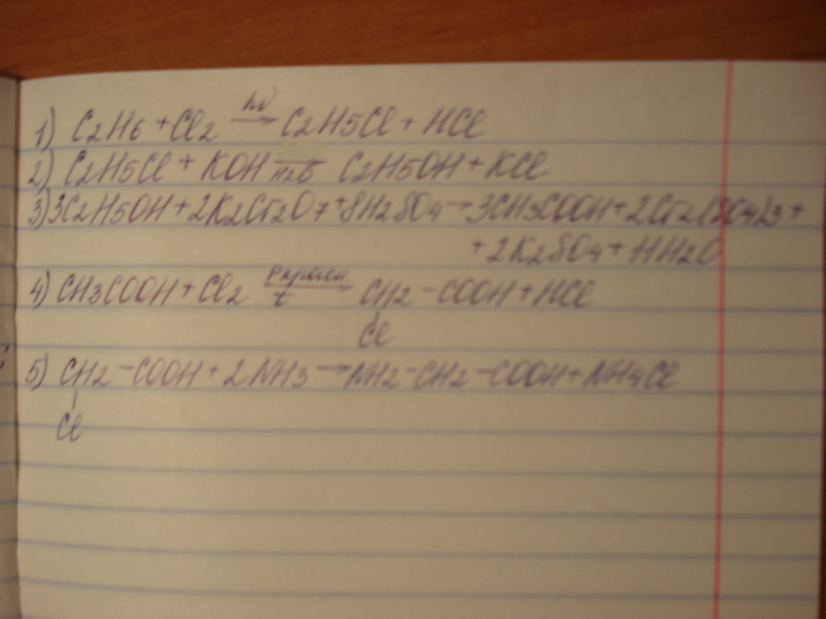 помогите пож-та: генетическая связь аминокислот C2H6 -> C2H5Cl -> C2H5OH -> CH3-COOH -> Cl-CH2-COOH -> NH2-CH2-COOH