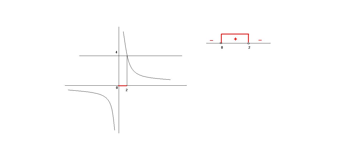 наносим на координатную прямую х=2 и х=0 и определяем знак на каждом промежутке,решаем методом интервалов и получаем xє(0;2)