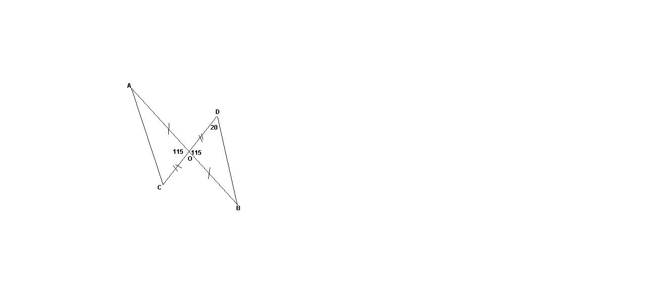 отрезки АB и CD пересекаются в точке О, которая является серединой каждого из них. Найдите угол OAC, если угол ODB=20 градусов, угол AOC=115 градусов. ПОМОГИТЕ ПОЖАЛУЙСТА.ЗАВТРА КОНТРОЛЬНАЯ!!!