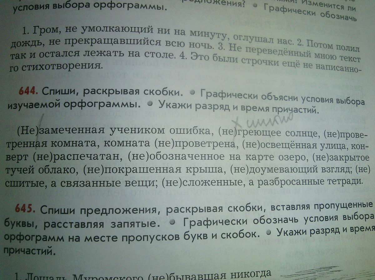 не замеченная учеником ошибка, негреющее солнце, непроветренная комната, комната не проветрена, не освещенная улица, конверт не распечатан, не обозначенное на карте озеро, не закрытое тучей облако, непокрашенная крыша, недоумевающий взгляд, не сшитые, а связанные вещи, не сложенные, а разбросанные тетради