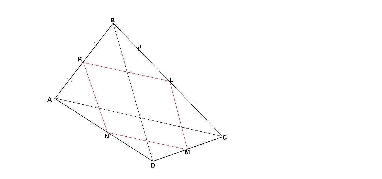 MN средняя линия треуг. ADC? значит MN=AC/2, MN параллельна АСТогда KL=MN? KL параллельна MN .Двепротивоположные стороны четірехугольника равны и параллельны, значит данный четырехуг. параллелограмм.(признак)