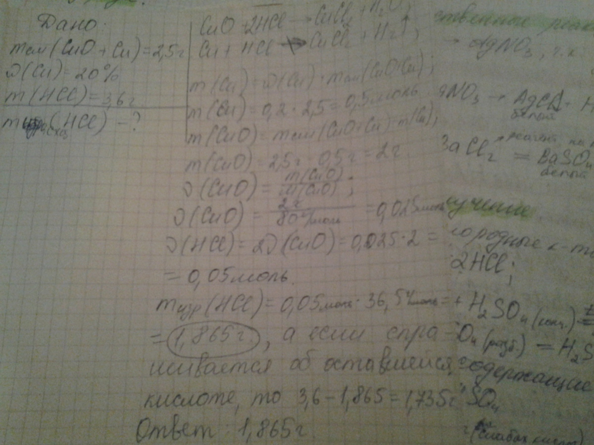 Смесь оксида меди 2 и металлической меди(меди 20%) массой 2,5г обработали раствором соляной кислоты (m(HCL) в растворе =3,6 г).Сколько кислоты израсходовано